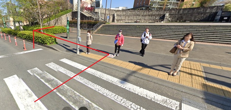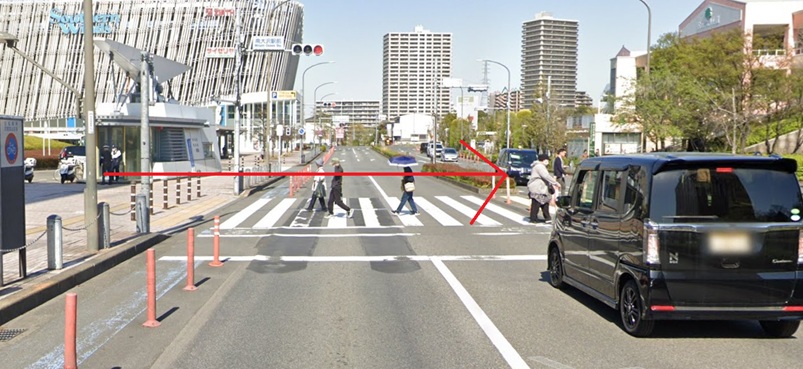 - 通りに出たら横断歩道を渡ります