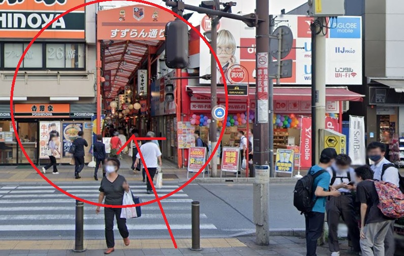- 目の前の横断歩道を渡ってすずらん通りというアーケード商店街に入ります
