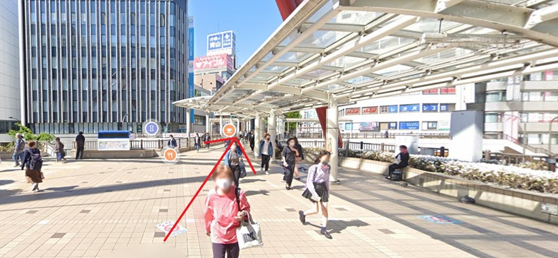 • ペディストリアンデッキをまっすぐ進みます